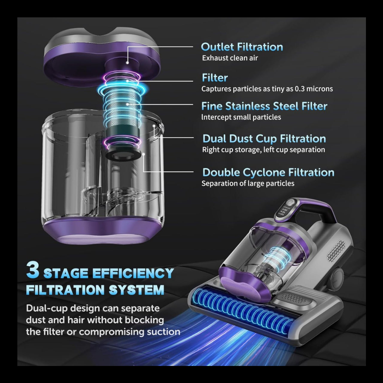 Its 3-level filtration system captures over 99% of microscopic particles, ensuring clean air output, while the dual-cup dust separation design minimizes clogging and simplifies maintenance. Designed for comfort, efficiency, and reliability, Colesy delivers professional-grade hygiene for everyday home use.