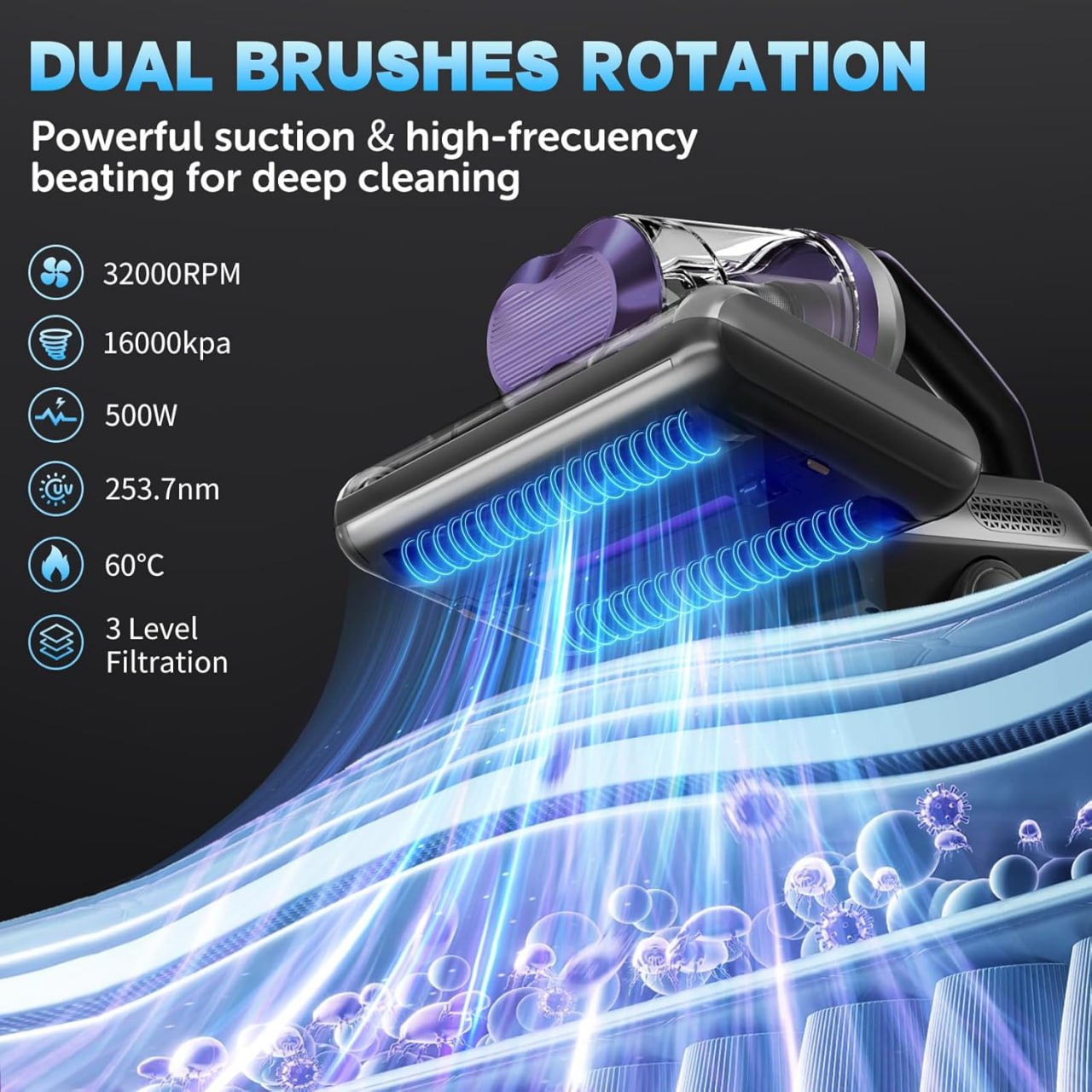 Featuring UV-C sterilization (253.7nm), ultrasonic vibration, and heated air technology, the device not only cleans visibly but also targets unseen contaminants embedded deep within mattresses and upholstery. This multi-layered cleaning approach helps maintain a healthier, fresher sleeping environment for you and your family.